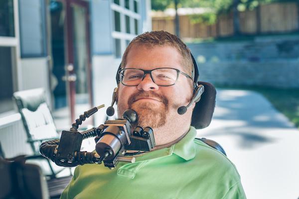 Illustration d’une personne utilisant un dispositif similaire à celui d’Aishé. Il s’agit ici de Todd Stabelfeldt utilisant notamment un joystick avec son menton.