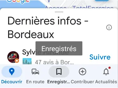 Celui-ci permet d’afficher un contenu dans un tooltip lors d’une pression longue sur un élément. Par exemple sous Google Map, en zoom 200 % la rubrique “Enregistrés” est tronquée et lors d’une pression longue dessus un tooltip apparait avec le texte complet et zoomé :