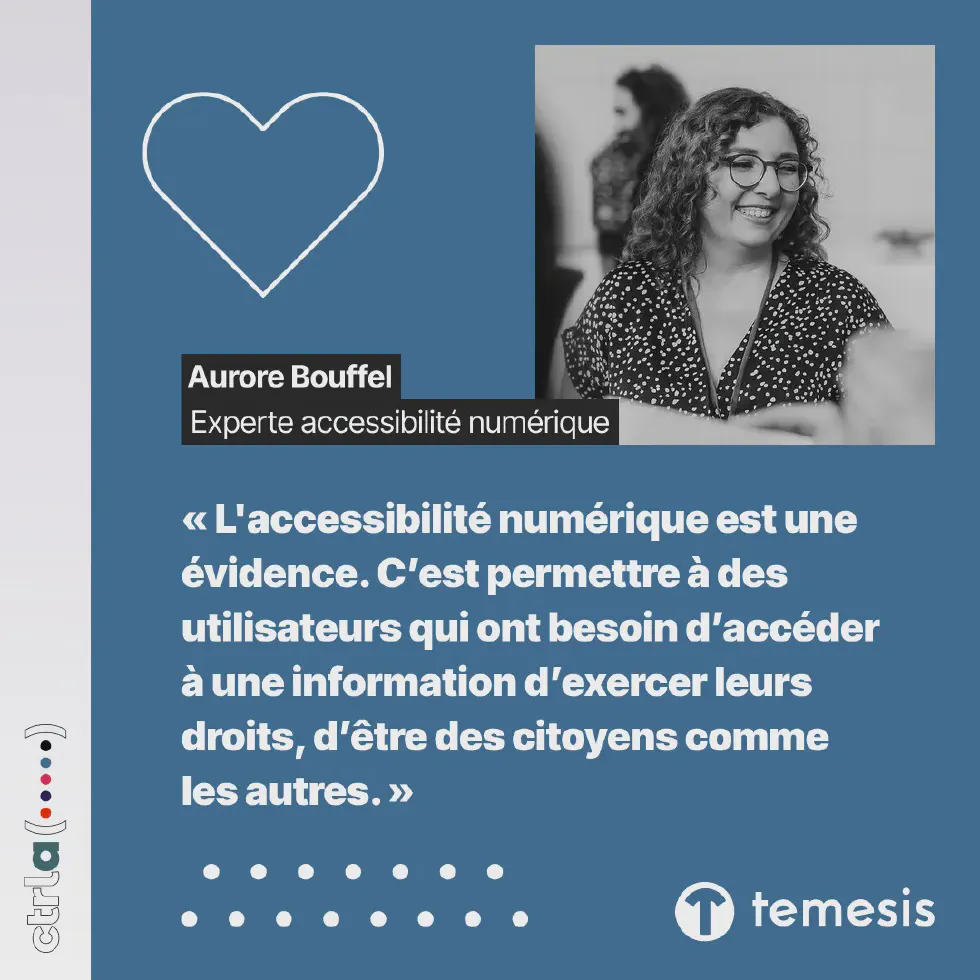 Aujourd’hui, Aurore met son expertise au service des autres à travers des audits de conformité, de l’accompagnement et de la formation. Ce qui l’anime ? Ces moments où elle voit les équipes s’approprier les enjeux de l’accessibilité, où une explication fait mouche, où elle sent que ses conseils vont concrètement améliorer l’expérience des utilisateurs. C’est là que je me sens le plus utile